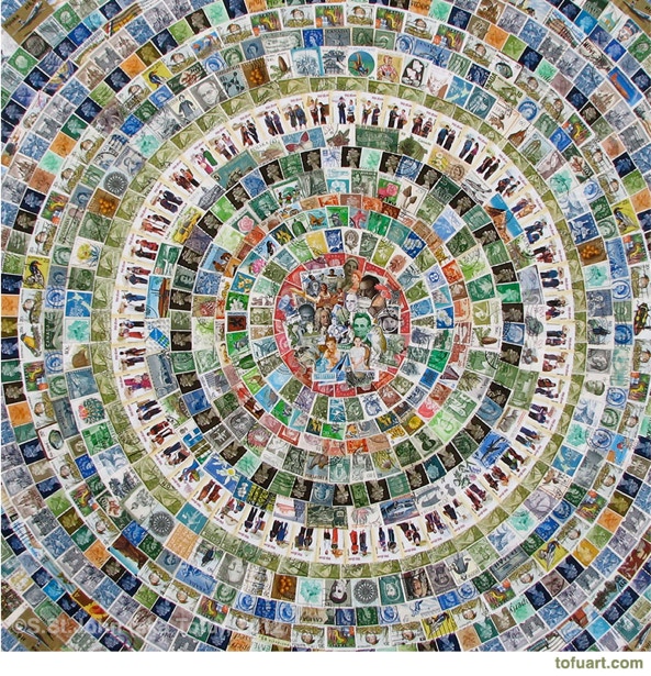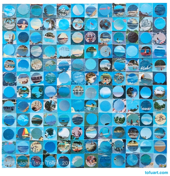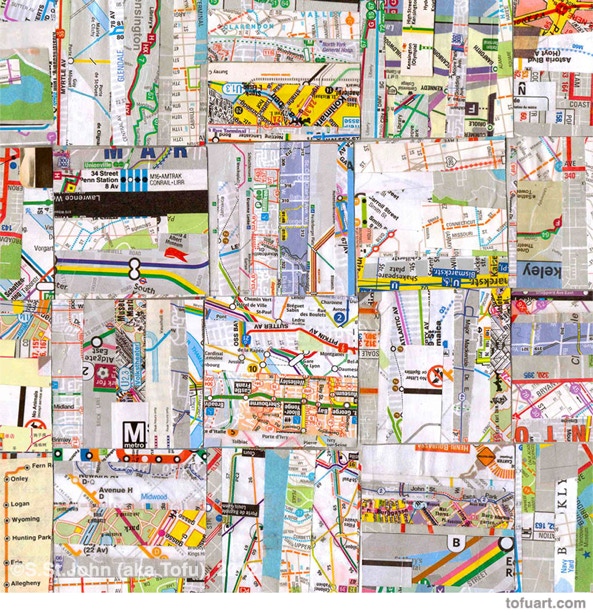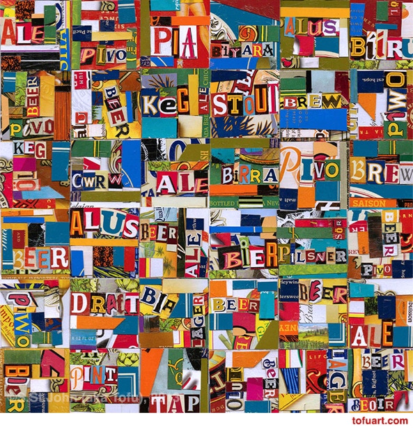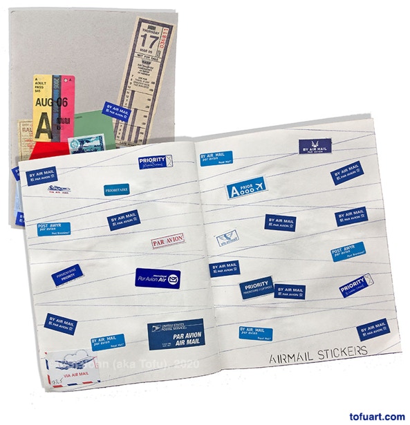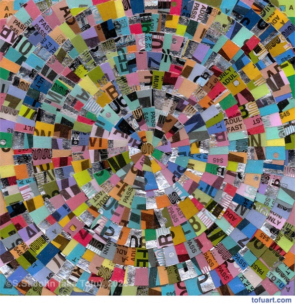 Some of the other materials I have used include postage stamps, postcards, beer packaging, hand-painted paper, MUNI Fast Passes, Plexiglas, old books and my own photos.