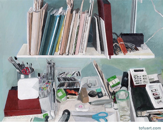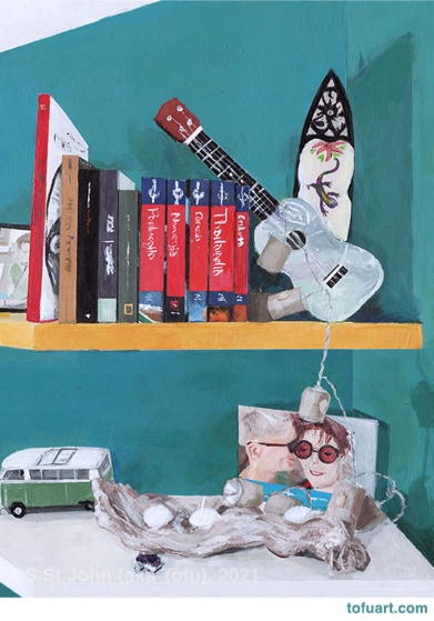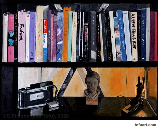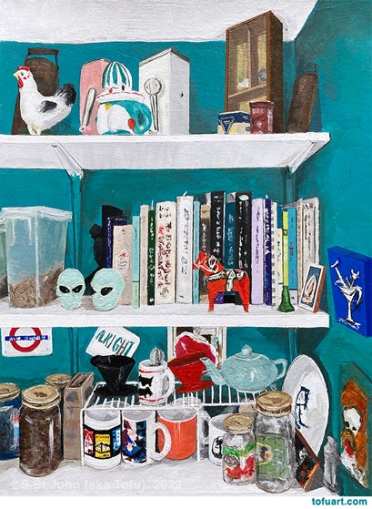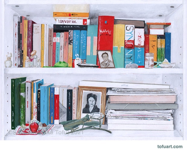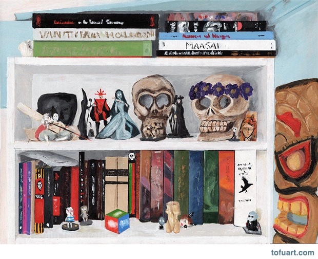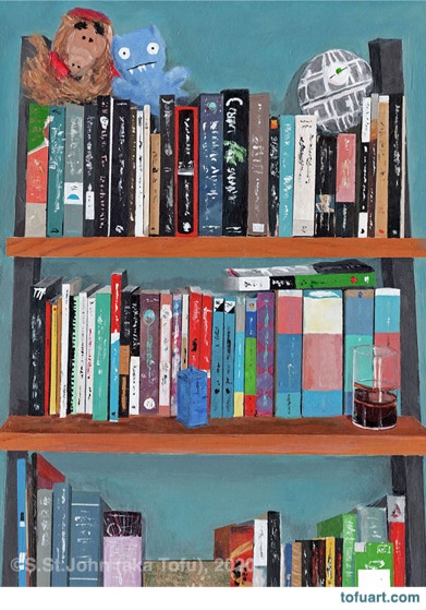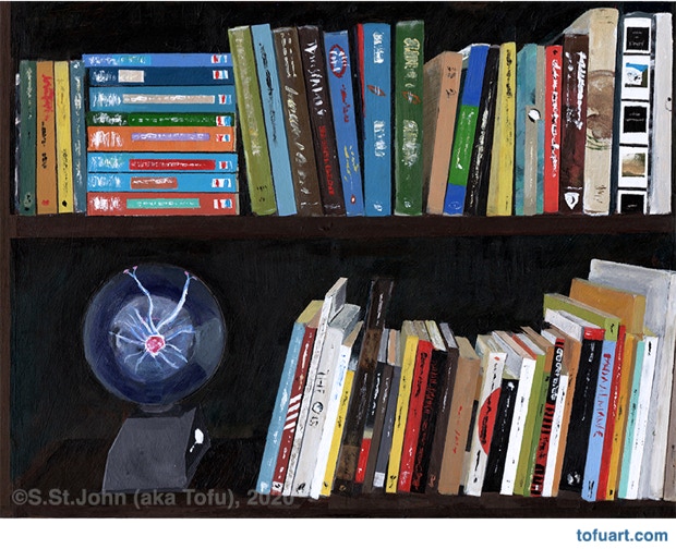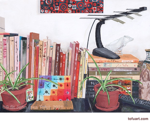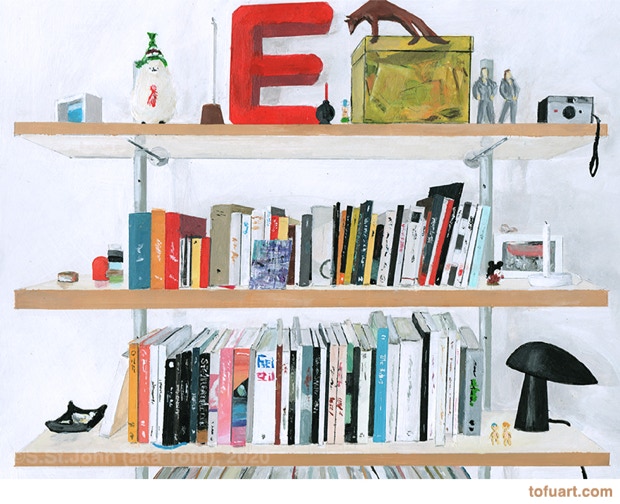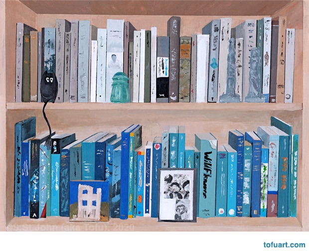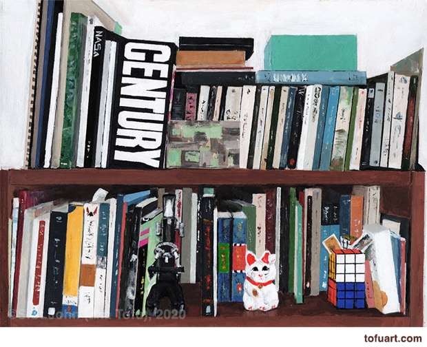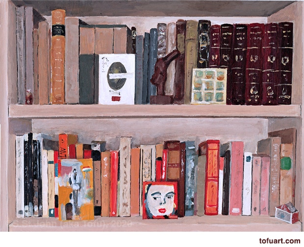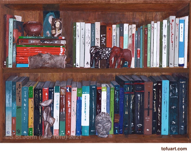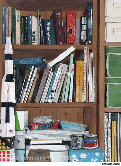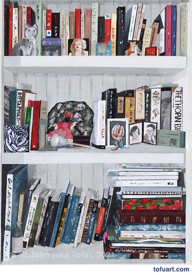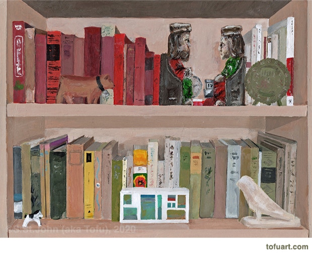 I was immediately inspired and began to paint my own bookcases. Then I started asking friends for photos of their bookcases. In some ways, a painting of a person’s books and things is as much a portrait as it is a still life.